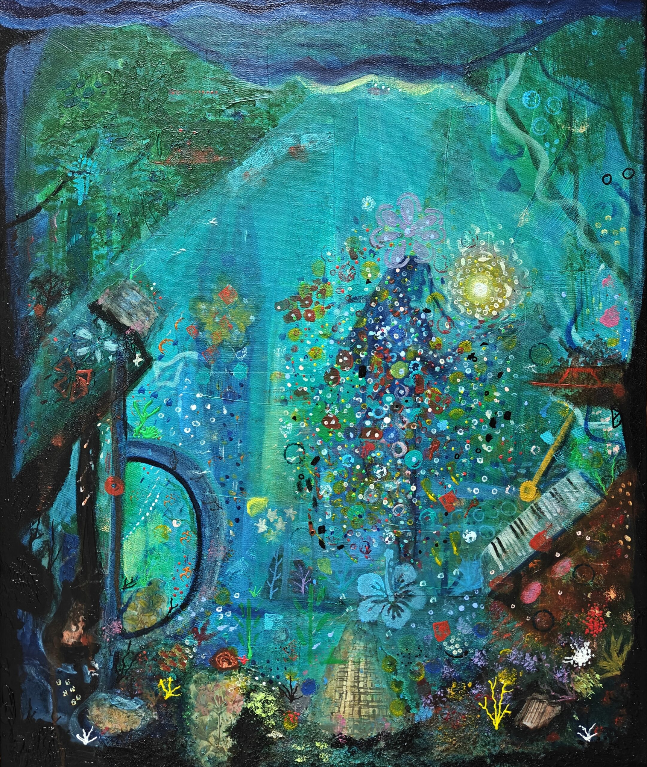 In this surreal, immersive dreamlike composition, the artist invites viewers into an underwater realm where music and nature coexist in harmony, just like the artist herself. Textured layers, floating florals, symbolic elements, and fragments of musical instruments merge to form a dreamlike symphony of color, light, and movement. The work reflects the emotional depth of the human experience—where chaos transforms into beauty, silence becomes melodic, and inner peace emerges from within. Each detail encourages contemplation, discovery, and a return to stillness.